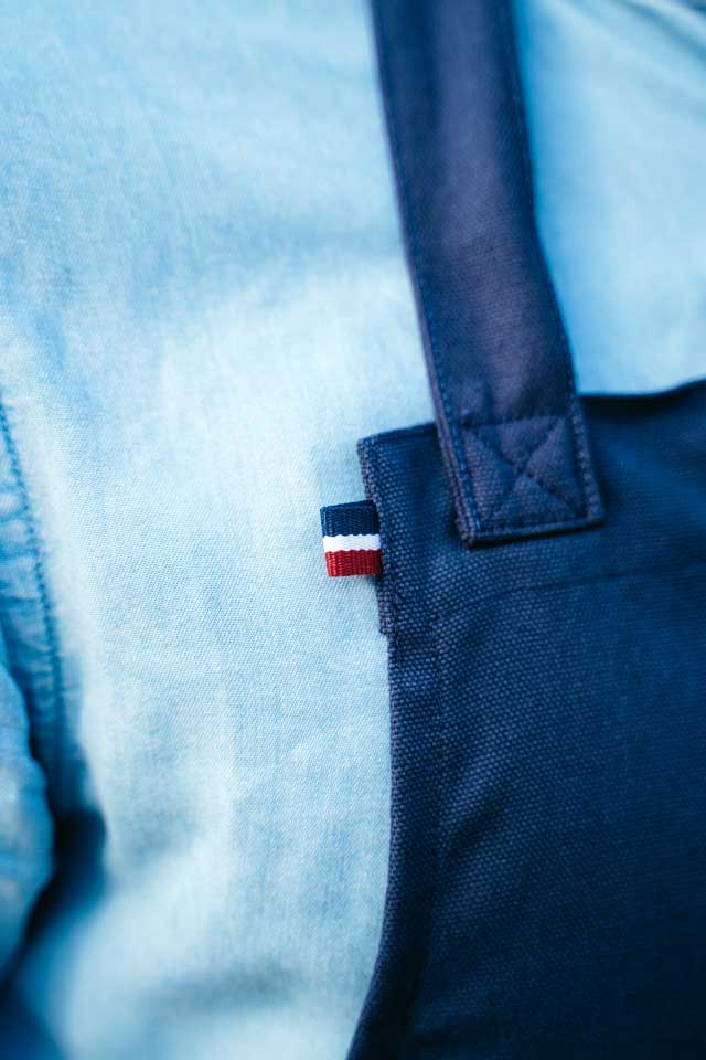De la sobriété et un zeste de chic, avec ses 2 boutons pression et son petit galon tricolore cousu sur la bavette.